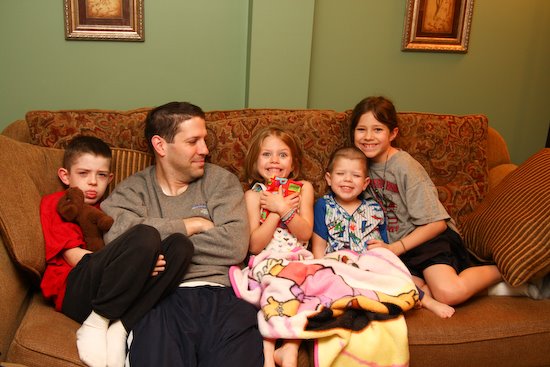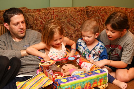 We have a tradition of opening presents on the morning of a birthday before the first person leaves the house (because who knows when Daddy will be home, and what little kid want to wait ALL DAY long to open their birthday presents??). This morning, everyone came downstairs at 7:00 to watch Reese open her gifts.
