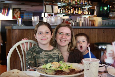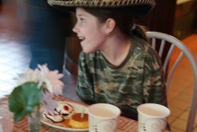 At the end of the meal, the staff decorated her with a fancy hat and sang happy birthday. Where else do you get flan with a candle in the middle of it, and gobs of whipped cream and cherries for the eyes? KitKat, Reese, and I had a great time helping her finish that!
