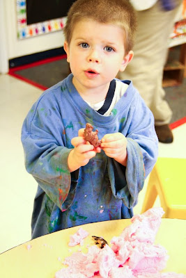 Yesterday we went with our friends, Safire and kids, to the Resource Center. We moms held babies while the 3 year olds played hard. Apple was thrilled with the pink playdough (it was the most popular center of the day) and he made 18 dye-drop Fall leaves out of coffee filters and food coloring. I am planning on decorating the house with them. :)