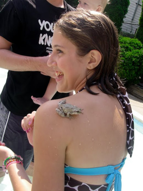 I’m not sure if I’d be smiling if there was a squishy frog on my back. Ick.